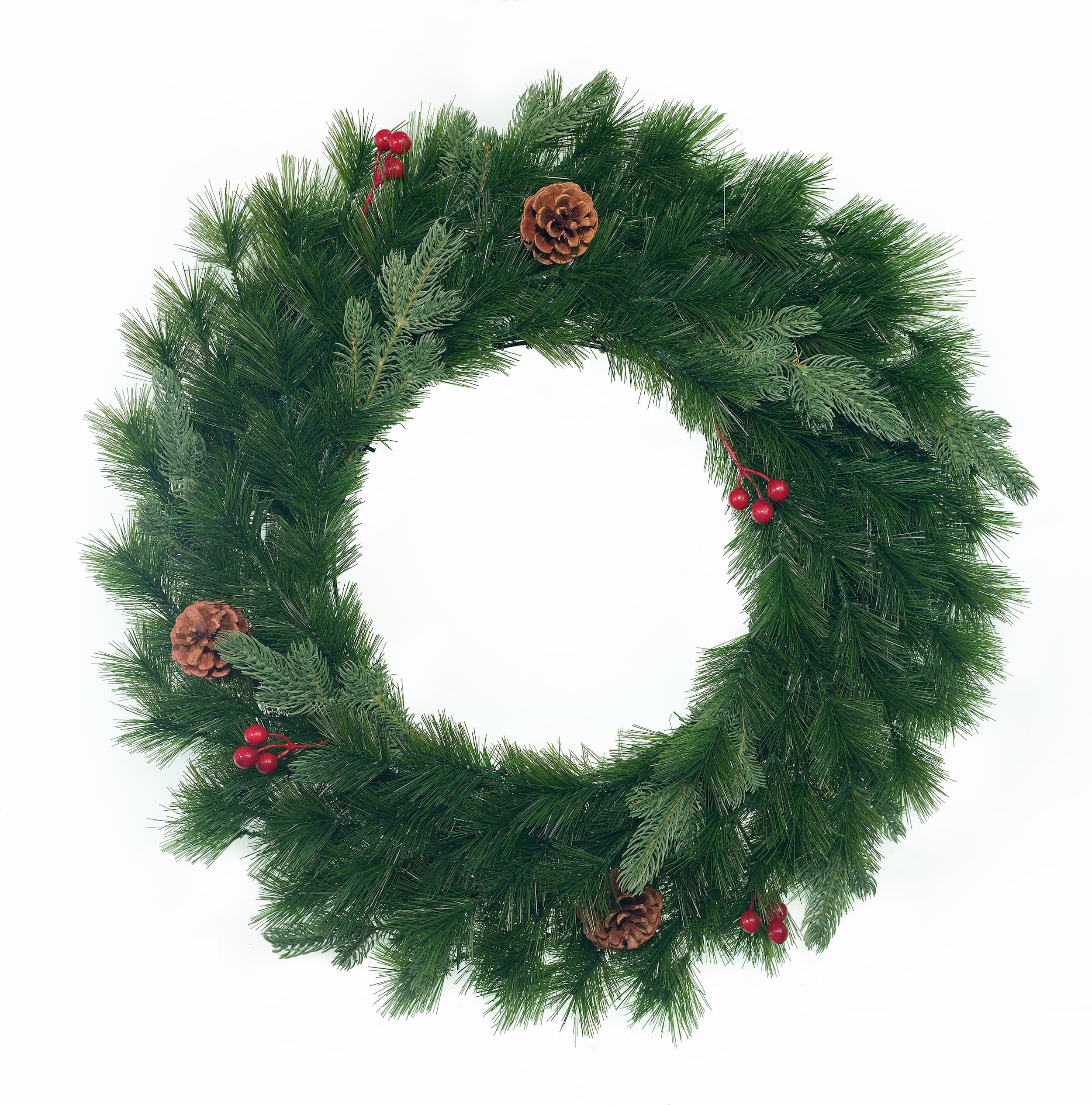 The Yorkshire Wreath is a premium product that uses hard-needle PVC base with molded PE leaves and pre-decorated elements. The pine cones and berries give it a bright appearance. This wreath can be displayed on your favorite door, mantelpiece, or wherever that needs a little more holiday cheer.