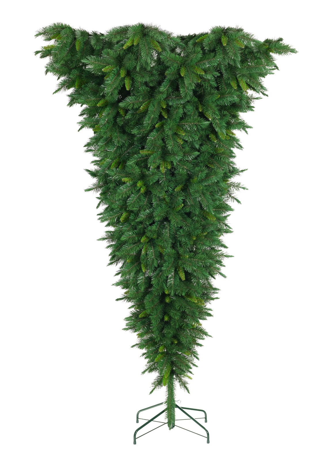 Our one-of-a-kind freestanding upside-down tree! This unique tree is great for entrance ways where you want more walking space or showcasing decorations. Because it is upside-down, decorations hang great from this tree. Comes in two-tone green with two different leaf types.